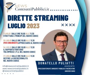 In questa pagina verranno rese note le dirette streaming che l’Avv. Donatello Puliatti terrà in materia di contratti pubblici ed in altre tematiche di potenziale interesse per gli utenti del sito. Tutte le dirette streaming saranno gratuite e non saranno registrare.